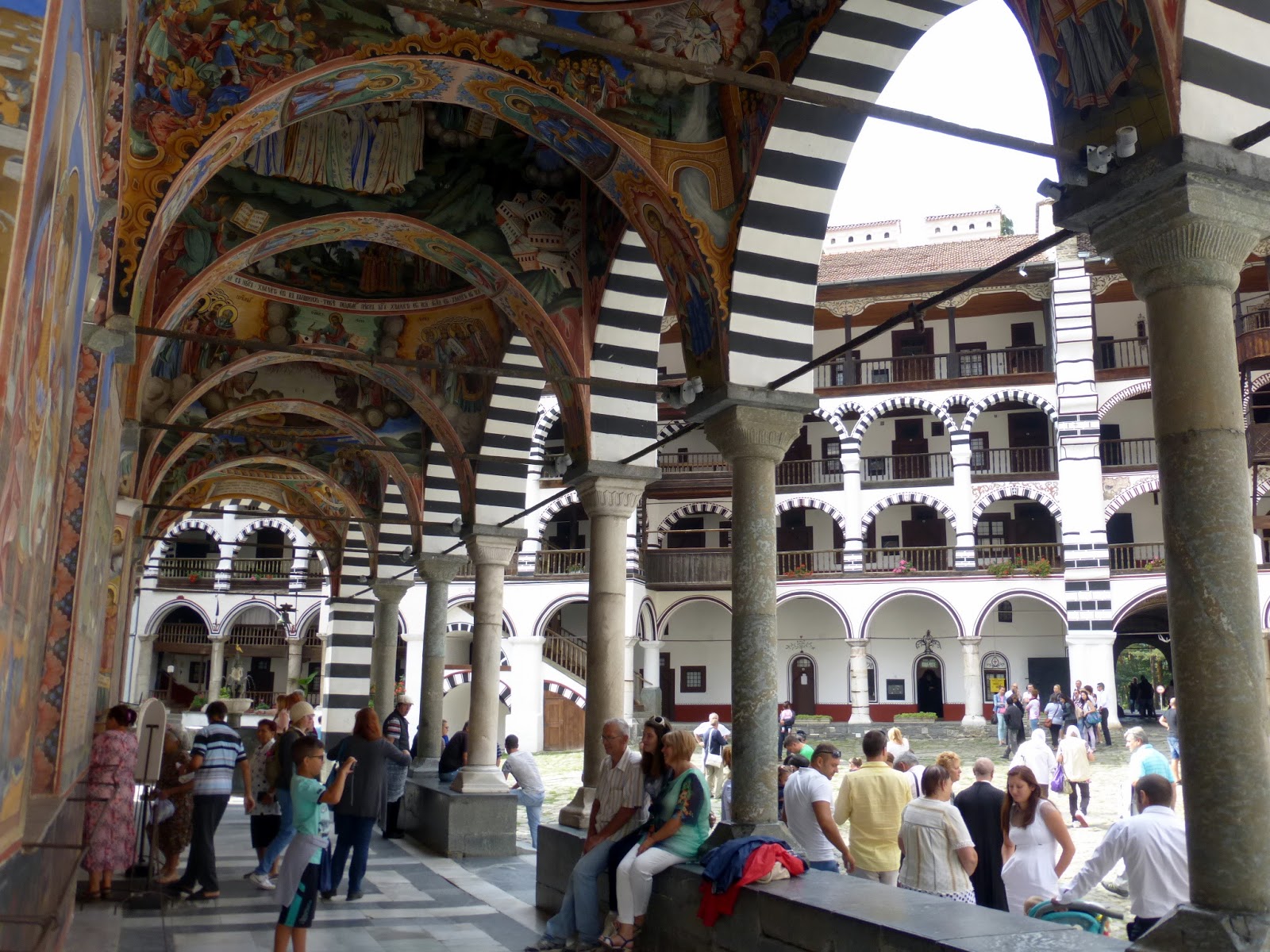 El monasterio de Rila fue fundado en el siglo X por un monje asceta llamado Iván Rilski (San Juan de Rila), canonizado por la iglesia ortodoxa, cuyo retrato vimos en la iglesia de Boyana en Sofia. El edificio actual nada tiene que ver con el original ya que se reconstruyó en el s XIX sobre las ruinas del monasterio que desapareció arrasado por un incendio. Solamente se conserva la Torre Jreliyova, del s.XIV , que fue la fortaleza del monasterio a la que han añadido una estructura para el reloj y las campanas y algunos iconos.